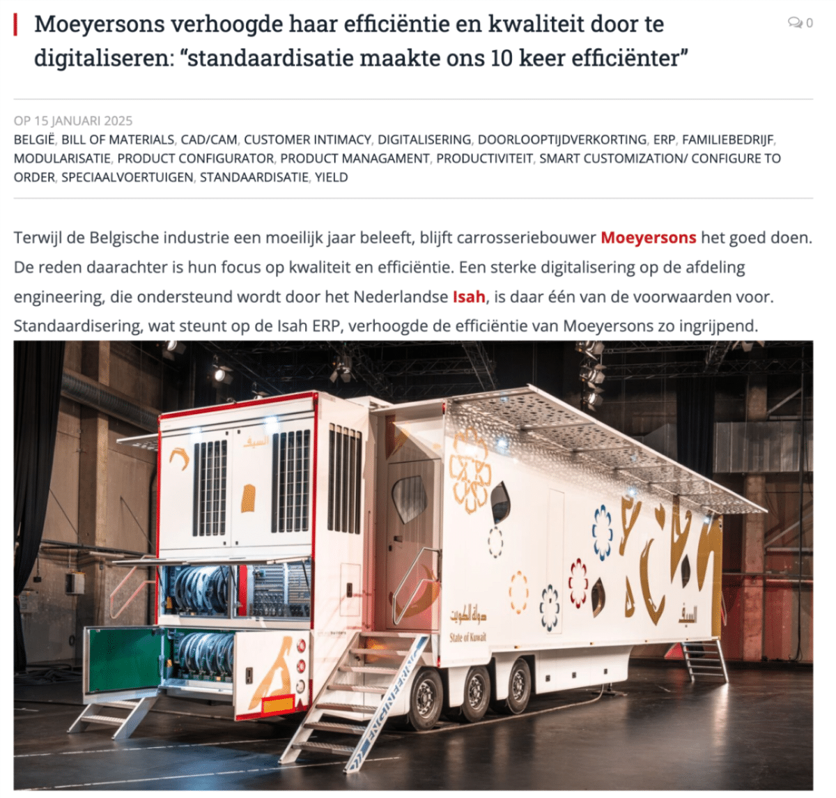 Moeyersons ging voor: “waarom moeilijk doen, als het gestandaardiseerd kan.” Door slim te gaan kijken welke onderdelen tot modules gevormd kunnen worden is, kunnen zij gestandaardiseerd maatwerk leveren. Met onderlinge relaties tussen de verschillende modules, weet je wat samen kan, én wat niet! We integreerden met Isah, om de verkoop aan de productie te koppelen.